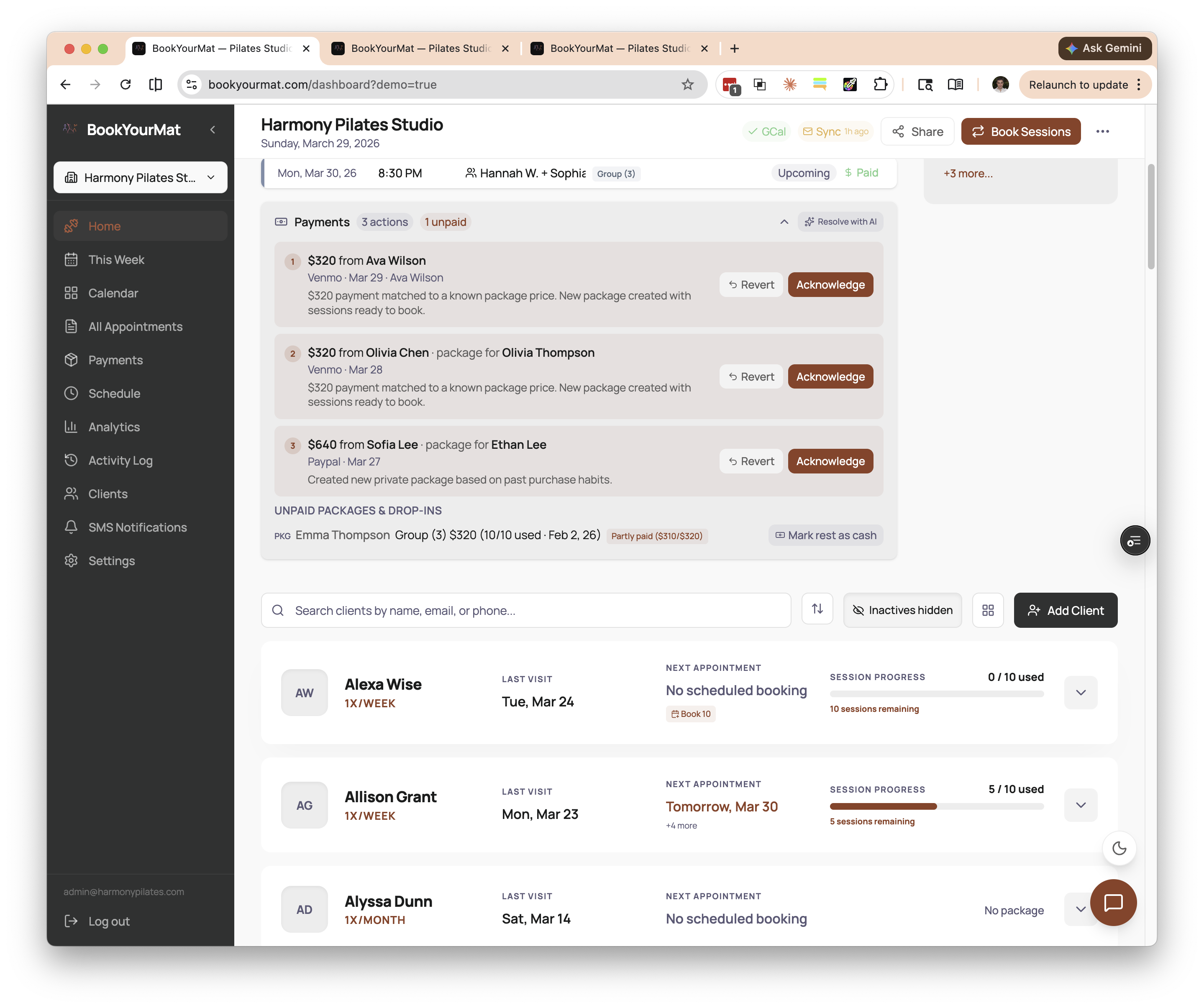 BookYourMat was built specifically for small studio owners who accept payments through Venmo, PayPal, and other peer-to-peer platforms. It automatically detects incoming payments, matches them to your clients, and keeps session packages up to date -- so you always know who has paid and how many sessions they have left. If you are tired of spreadsheets and manual tracking, take a look at what BookYourMat can do for your studio.