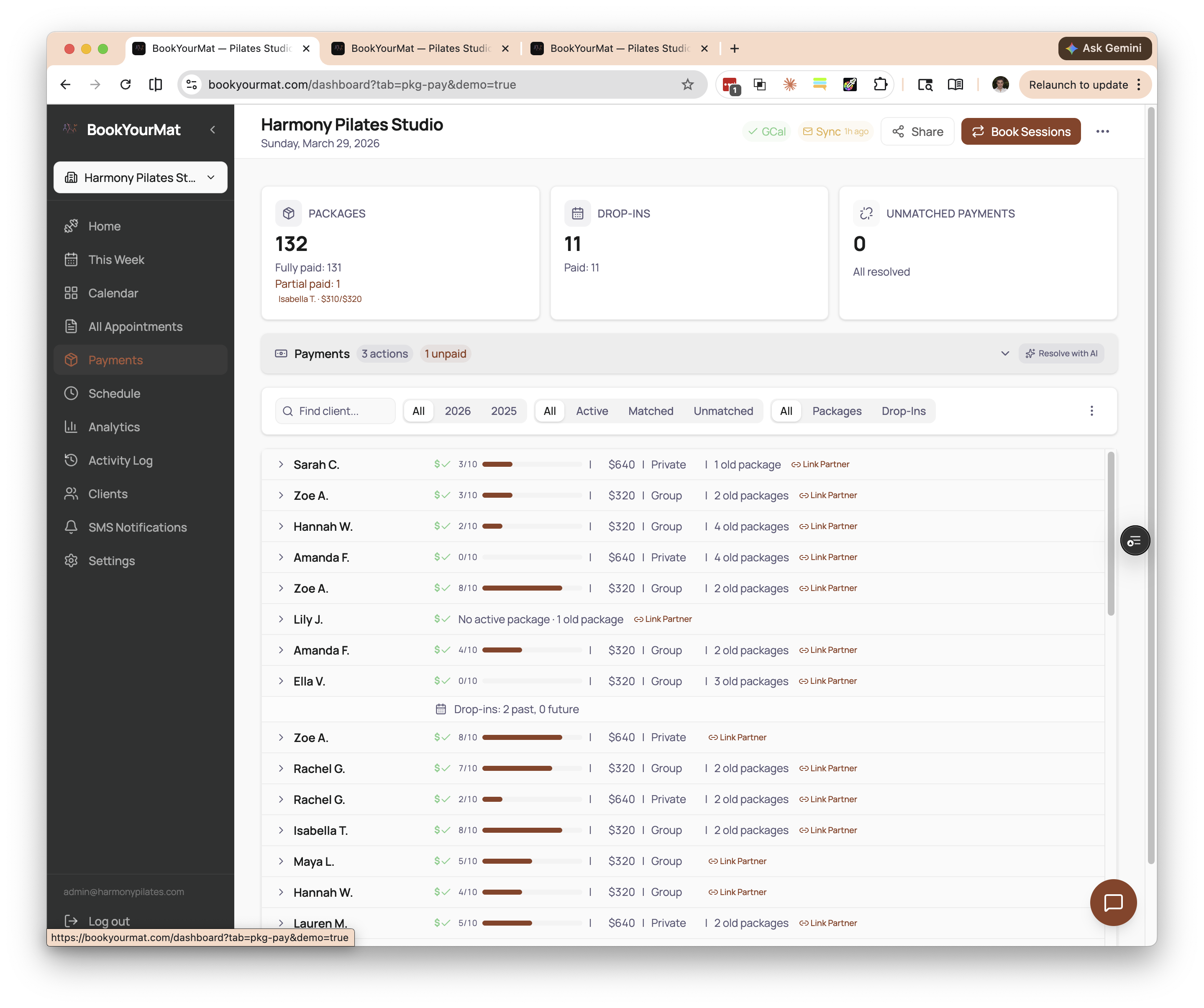 The payments view shows exactly who has paid, which package they purchased, and how their sessions are tracking -- all updated automatically.